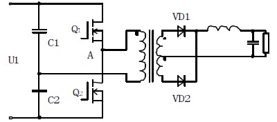 在PWM變換器工作時,伴隨著開關器件的工作,也相應產生了共模噪聲。如圖1 所示,對于半橋變換器,開關管Q1 的漏級電壓始終為U1,源級電位隨開關狀態的改變而在0 和U1/2 之間變化;Q2 的源極電位始終為0,漏極電位在0 和U1/2之間變化。為使開關管和散熱器能保持良好接觸,往往在開關管底部與散熱器之間加上絕緣墊片或者抹上導熱性能良好的絕緣硅膠。這使得A 點對地之間相當于存在一個并聯耦合電容CK。當開關管Q1、Q2 的狀態發生改變,使A 點電位發生變化時,就會在CK 上產生噪聲電流Ick,如圖2 所示。該電流由散熱器到達機殼,而機殼也即大地與主電源線存在耦合阻抗,形成圖2中虛線所示的共模噪聲通路。于是,共模噪聲電流在地與主電源線的耦合阻抗Z 上產生壓降,形成共模噪聲。