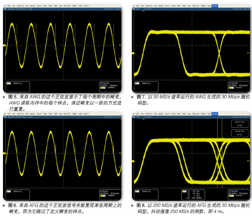 之所以出現抖動,是因為AFG擁有固定的取樣速率,其不是數據速率的倍數。AWG則沒有這種限制(盡管任何實際環境信號源都會產生某些抖動)。