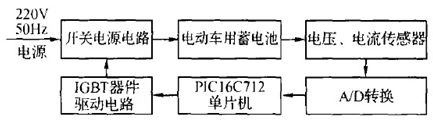 目前,電動車電池作為一種儲能裝置,主要以鉛酸蓄電池為主,充電器是專門針對鉛酸蓄電池所設(shè)計(jì)的。傳統(tǒng)的蓄電池充電器采用電流/電壓負(fù)反饋的方法來達(dá)到恒流/恒壓充電的目的,為了實(shí)現(xiàn)充電過程各種工作參量的實(shí)時監(jiān)測及智能多段式充電策略的精確控制,引入電流/電壓反饋環(huán),應(yīng)用P IC16C712 單片機(jī)及相應(yīng)的控制電路,其硬件結(jié)構(gòu)框圖如圖1所示,電路圖如圖2所示。