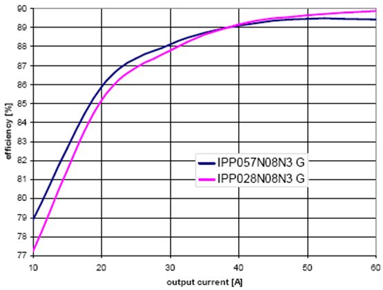 圖8表明了在實(shí)際應(yīng)用中,不同MOSFET RDS(on) 值范圍的影響。圖中所示為在服務(wù)器電源中分別測(cè)得的IPP028N08N3 G和IPP057N08N3 G的值。