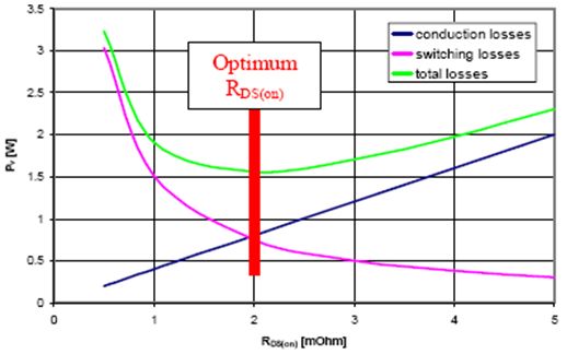 當(dāng)RDS(on)在1毫歐姆至3毫歐姆范圍內(nèi)時(shí),總功耗始終大致相同。但是,在1毫歐姆以下,RDS(on)僅下降0.5毫歐姆,便會(huì)令總功耗提高一倍,從而嚴(yán)重降低電源轉(zhuǎn)換器的效率。
