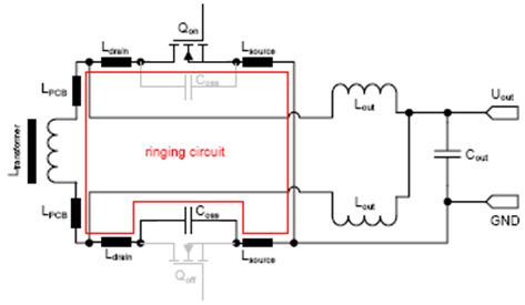 并且,環(huán)路的寄生電阻會(huì)抑制振蕩(Coss = MOSFET的輸出電容, Lstray = Lsource + Ldrain + LPCB + Ltransformer)。僅當(dāng)二次側(cè)的環(huán)路電感限制了電流換向時(shí),此處討論的波形形狀才有效。這就意味著,限制di/dt的不是一次側(cè)MOSFET的開(kāi)啟速度,而是電源的二次側(cè)的雜散電感。