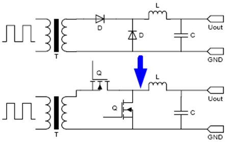 隨便看一個(gè)開(kāi)關(guān)電源,你都可以在電源轉(zhuǎn)換器的二次側(cè)發(fā)現(xiàn)一個(gè)整流級(jí)。整流級(jí)的任務(wù)是對(duì)經(jīng)由變壓器從SMPS的一次側(cè)轉(zhuǎn)移至二次側(cè)的方波電源信號(hào)進(jìn)行整流。SMPS通常利用功率二極管來(lái)實(shí)現(xiàn)整流(請(qǐng)參見(jiàn)圖1)。但是,功率二極管具有0.5 V乃至更高的正向壓降,并且會(huì)產(chǎn)生較高輸出電流,因此會(huì)造成嚴(yán)重的導(dǎo)通損耗,從而大大影響整個(gè)電源轉(zhuǎn)換器的能效。為了最大限度地降低這些整流損耗,可以利用最新功率MOSFET來(lái)代替二極管。最新的功率MOSFET能夠大幅降低導(dǎo)通損耗,特別是在輸出電流較高的情況下。在考慮低負(fù)載效率時(shí),關(guān)注的焦點(diǎn)不是導(dǎo)通損耗,而是開(kāi)關(guān)損耗。因?yàn)橄啾扔诙O管,MOSFET的開(kāi)關(guān)損耗高得多。對(duì)系統(tǒng)能效的其他重要影響來(lái)自柵極驅(qū)動(dòng)和旨在遏制關(guān)斷過(guò)程中的過(guò)電壓尖峰的緩沖網(wǎng)絡(luò)。這是一個(gè)十分復(fù)雜的系統(tǒng),因此,必須深刻理解所有參數(shù)相互之間的關(guān)系,才能優(yōu)化系統(tǒng)能效。