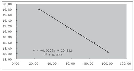 因測試時間較短,可以將測量時恒溫箱設置溫度近似等于LED光源的結溫。在600mA恒流的情況下,通過數學方法不難得出光源模塊正向電壓與結溫的關系。利用Excel工具,以溫度為X軸,平均值為Y軸,生成(X,Y)散點圖,選擇線性回歸分析類型則可生成如下趨勢圖和公式。