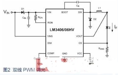 雙線PWM調(diào)光是用于汽車內(nèi)部照明的常見方法。當(dāng)VIN被調(diào)制為低于 VIN-NOMINAL的 70% 時,VINS引腳(圖2)檢測電壓的變化,并將PWM波形轉(zhuǎn)換為和輸出驅(qū)動電路相應(yīng)的PWM。這種方法的缺點(diǎn)是轉(zhuǎn)換器的電源必須包含一個電路,以便為其直流輸出提供 PWM 波形。