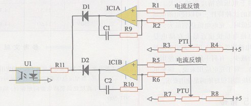 對于本應用中, 只要比較反饋控制電路里的兩個PI調節器( 圖8中IC1A和IC1B) 的輸出端電壓高低, 就能實現狀態指示。當IC1A輸出電壓高于IC1B輸出電壓時, 電流反饋起作用, 電路處于充電狀態。反之, 處于浮充狀態。