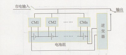 圖2所示是本文提出的一種蓄電池組均衡充電模式結構示意圖, 圖中CM表示充電器或充電模塊。在這種均衡式充電模式中, 對電池組的每一節電池都單獨配置一個充電模塊, 它是均衡式充電裝置的核心。在應急電源中, 當處于非應急狀態運行時, 應急電源的輸出通過開關直接由市電供給, 這時, 逆變器不工作, 各充電模塊給各節相應的電池進行充電或浮充電。當應急電源處于應急工作狀態時, 由電池組給逆變器供電, 通過逆變器輸出應急逆變交流電源。這時, 由于各充電模塊無交流輸入, 處于不工作狀態, 不影響蓄電池組的放電工作狀態。