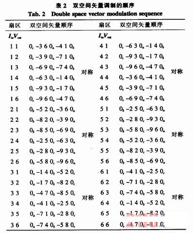 空間矢量調(diào)制法只確定開關(guān)間隔中應用電壓矢量的占空比,從而獲得低頻率的輸出電壓和輸入電流的平均值,但是并沒有確定使用的順序。所以需要使用雙空間矢量調(diào)制法,同時也可改善波形的質(zhì)量。圖2表明了輸入電流在4扇區(qū),輸出電壓在5扇區(qū)應用雙空間矢量調(diào)制的順序。電壓矢量在開關(guān)間隔中對稱分布,零矢量每4個開關(guān)間隔使用一次。在每次開關(guān)轉(zhuǎn)換中只有一個開關(guān)狀態(tài)發(fā)生改變以最大程度地降低損耗。在圖2中通過表格2確定相應開關(guān)時間: