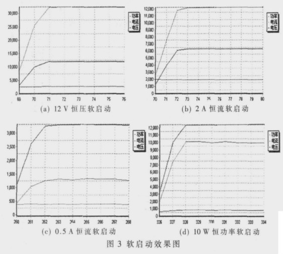 從圖3 的軟啟動(dòng)效果圖可以看出, 在恒定電壓、電流、功率的模式下工作時(shí), 系統(tǒng)開(kāi)機(jī)過(guò)程超調(diào)量很小, 有效地控制了啟動(dòng)過(guò)程, 防止了啟動(dòng)過(guò)程產(chǎn)生過(guò)大的擾動(dòng)電壓, 產(chǎn)生過(guò)大的功率, 有效地保護(hù)了負(fù)載。