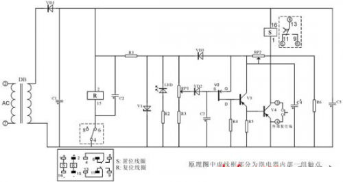 由V2 P溝道場效應管、V3、V4三極管以及繼電器為主要器件構成的斷電延時型繼電器示于圖2。如下:端加入工作電源后,C1~C5都按其回路完成充電過程(充電時間應參照產品規定的時間)。同時內部2繞組閉鎖繼電器R復位線圈得電工作(虛框內轉換觸點4與6由電源接通轉為斷開狀態,4與8接通),相應外部觸點進行轉換端接通,呈延時工作狀態)。