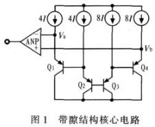 本文提出的電路核心結構如圖1所示,在電路中雙極晶體管構成了電路的核心,實現(xiàn)了VBE與VT的線性疊加,獲得近似為零溫度系數(shù)的輸出電壓。圖1中雙極型晶體管Q1和Q2的發(fā)射區(qū)面積相同,Q3和Q4的發(fā)射區(qū)面積相同,考慮設計需求,取Q1和Q2的發(fā)射區(qū)面積為Q3和Q4的發(fā)射區(qū)面積的8倍。