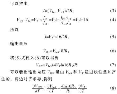 帶隙基準電壓源的目的是產(chǎn)生一個對溫度變化保持恒定的量,由于雙極型晶體管的基極電壓VBE,其溫度系數(shù)在室溫(300 K)時大約為-2.2 mV/K,而2個具有不同電流密度的雙極型晶體管的基極-發(fā)射極電壓差VT,在室溫時的溫度系數(shù)為+0.086 mV/K,由于VT與VBE的電壓溫度系數(shù)相反,將其乘以合適的系數(shù)后,再與前者進行加權,從而在一定范圍內(nèi)抵消VBE的溫度漂移特性,得到近似零溫度漂移的輸出電壓VREF,這是帶隙電壓源的基本設計思想。