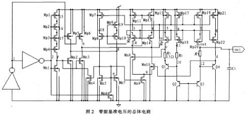 帶隙基準電壓源總體電路總共由4部分組成:A部分是啟動電路,B部分提供偏置電壓,C部分是運算放大器,D部分是帶隙電壓源的核心部分。其中核心部分是由雙極晶體管構成,實現(xiàn)了VBE和VT的線性疊加,獲得近似零溫度系數(shù)的輸出電壓。總體電路如圖2所示。