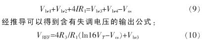 基準源中運放的設計是非常重要的,運放的失調(diào)是基準源的一個主要誤差源。由于不對稱性,運放會受到輸入失調(diào)的影響。假設失調(diào)電壓為Vos,經(jīng)計算得到含失調(diào)電壓的輸出公式為: