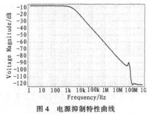 圖4是在1 Hz到10 GHz的范圍進行掃描所得到的不同的電源抑制情況。低頻時抑制情況不太好,在-10 dB左右,還有待于提高;高頻抑制情況很好,基本穩(wěn)定在-120 dB左右。與傳統(tǒng)電路相比,本文提出的這種電路可以用于在各種系統(tǒng)尤其是高頻系統(tǒng)中,這一點是傳統(tǒng)電路所無法比擬的。