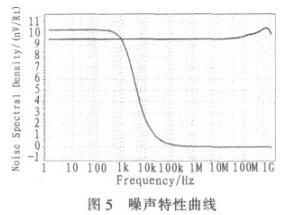 噪聲是影響帶隙基準源穩(wěn)定性的主要因素之一。通常噪聲分為外部噪聲和內(nèi)部噪聲。外部噪聲一般都由電源電壓的變化以及其他電路的干擾造成。內(nèi)部噪聲主要包括熱噪聲和閃爍噪聲。閃爍噪聲的大小與頻率成反比,因而在低頻下主要為閃爍噪聲,而高頻下為熱噪聲,對于高頻的熱噪聲,可以在輸出端Vref處加一個RC低通濾波器解決掉,而低頻的來自耦合到電源的噪聲則是需考慮的,可以通過提高電源抑制比來減小。圖5為電路在輸出端和電源電壓處的噪聲特性,在輸出端低頻時噪聲為10.4 nv/Rt,高頻時噪聲幾乎為0 nv/Rt,性能很好。電源電壓處的噪聲為9.6nv/Rt左右。
