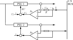 如圖5所示,當(dāng)輸出達(dá)到均流時(shí),輸出電流I1為零。反之,則電阻R上由于有電流I1流過(guò),在其兩端產(chǎn)生一個(gè)電壓Uab,這個(gè)電壓經(jīng)過(guò)放大器A輸出電壓Uc,它與基準(zhǔn)電壓Ur比較后的ΔU,反饋回電源模塊的控制部分,從而調(diào)節(jié)輸出電流,最終實(shí)現(xiàn)均流。