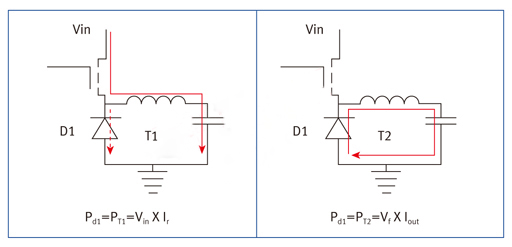 當時間為T2時,輸出電流(Iout)流經D1。所產生的損耗與D1的正向電壓(Vfw)和輸出電流直接相關。PT2等于Iout*Vfw。顯然,我們希望盡可能降低以控制損耗,減少發熱。