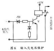 輸出電壓低于規(guī)定值時,反映了輸入直流電源、開關(guān)穩(wěn)壓器內(nèi)部或者輸出負載發(fā)生了異常。輸入直流電源電壓下降到規(guī)定值之下時,會導(dǎo)致開關(guān)穩(wěn)壓器的輸出電壓跌落,輸入電流增大,既危及開關(guān)三極管,也危及輸入電源。因此,要設(shè)欠電壓保護。簡單的欠電壓保護如圖6所示。