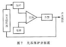 當未穩(wěn)壓輸入的電壓值正常時,穩(wěn)壓管ZD擊穿,晶體管V導(dǎo)通,繼電器動作,觸點吸合,開關(guān)穩(wěn)壓器加電。當輸入低于所允許的最低電壓值時,穩(wěn)壓管ZD不通,V截止,觸點跳開,開關(guān)穩(wěn)壓器不能工作。開關(guān)穩(wěn)壓器內(nèi)部,由于控制電路失常或者開關(guān)三極管失效會使輸出電壓下降;負載發(fā)生短路也會使輸出電壓下降。特別在升壓型或反相升壓型的直流開關(guān)穩(wěn)壓器中欠電壓的保護是跟過電流保護緊密相關(guān)的,因而更加重要。實現(xiàn)方法是在開關(guān)穩(wěn)壓器的輸出端接電壓比較器,如圖7所示。