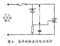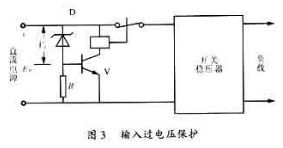開關(guān)穩(wěn)壓器的過電壓保護包括輸入過電壓保護和輸出過電壓保護。開關(guān)穩(wěn)壓器所使用的未穩(wěn)壓直流電源諸如蓄電池和整流器的電壓如果過高,使開關(guān)穩(wěn)壓器不能正常工作,甚至損壞內(nèi)部器件,因此,有必要使用輸入過電壓保護電路。用晶體管和繼電器組成的過電壓保護電路如圖3所示。