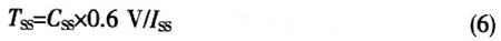 該器件無允許快速啟動的內部軟啟動,但是也會產生大的浪涌電流。因此,對于需要降低浪涌電流的應用,該器件有限制DC/DC轉換調節器啟動時浪涌電流的電路。浪涌電流限制電路可作為軟啟動。外部的SS引腳用來調節軟啟動的特殊應用。電流ISS影響外部軟啟動電容器CSS,軟啟動時間計算為: