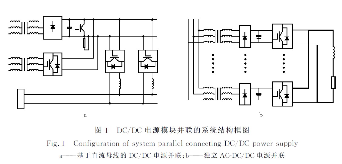 DC/DC電源并聯(lián)有兩種拓撲結構,一種是采用輸入直流母線結構,其系統(tǒng)結構框圖如圖1a所示,主要包括整流變壓器和不可控二極管整流電路,N 路DC/DC變換器,泵升電壓抑制電路等;另一種是采用獨立的AC-DC/DC電源并聯(lián),系統(tǒng)結構圖如圖1b所示。