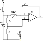 圖4為變壓器過熱保護電路,R3=R4,NTC為粘貼在變壓器上的負溫度系數的熱敏電阻,常溫下RNTCR2,運放U1構成滯環比較器。正常工作時,NTC阻值較大,運放U+<U-,輸出為零;當溫度上升到設定值時,運放U1輸出為高電平,送到PWM控制芯片使輸出脈沖關斷。