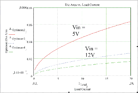 我們以頂部MOSFET為例,下圖2所示為在不同輸入電壓時最優(yōu)化裸片面積和負載電流之間的關(guān)系。仔細地考察發(fā)現(xiàn),當輸入電壓從19V變到5V時,裸片面積增加。