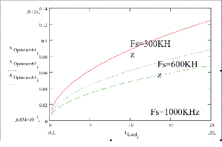 圖4:在同步整流器MOSFET不同開關(guān)頻率上的最優(yōu)化裸片面積是負載電流的函數(shù)。