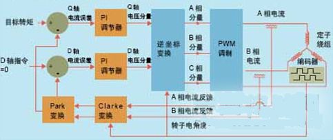 從控制原理上講,磁場定向控制方法的電流環(huán)運(yùn)行是獨(dú)立于電機(jī)旋轉(zhuǎn)的。在FOC方法中存在兩個實際的電流環(huán),一個用于Q軸轉(zhuǎn)矩,另一個用于D軸轉(zhuǎn)矩。Q軸轉(zhuǎn)矩電流環(huán)施以來自伺服控制器的用戶目標(biāo)轉(zhuǎn)矩,D軸電流環(huán)則施以零輸進(jìn)指令,以便使不想要的直軸分量降至最低。