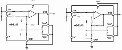 雙極性輸出時AD8205可以測量流過采樣電阻上的雙向電流,這時,輸出可以偏置到輸出范圍內的任意位置。當被檢測的正反兩個方向上的電流為等幅時,其輸出必須偏置到滿量程輸出的中間位置。當雙向電流幅值不對稱時,輸出偏置可以對應地偏離半量程位置。它的兩個參考輸入VREF1和VREF2分別連接一個內部電阻RREF后接到同一個內部偏置節點,這兩個參考輸入端的操作方式完全相同。在兩個參考電壓輸入端接入對應的電壓,即可完成對輸出的偏置。在雙極性輸出方式下,一般有以下兩種連接方式。