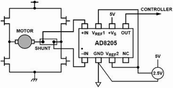 如圖5所示連接,AD8205在H橋馬達控制電路中作為控制回路的一部分,馬達和采樣電阻串連后放置在H橋的中間,通過檢測采樣電阻上的電壓,可以準確地測量馬達當前的電流及其方向。此時,AD8205的輸出被設定成外部參考雙向的方式,這樣它可以測量H橋開關的雙向電流并同時監測馬達的運轉方向。由于地不是一個特別穩定的參考電平,以地為參考將會導致測量的不準確性。因此,這種測試方案要比以地作為參考電平的測試方法好的多。