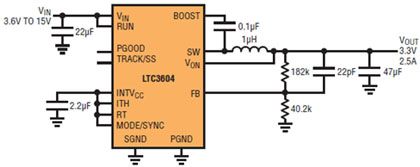 LTC3601 和 LTC3604 是高性能單片同步降壓型穩(wěn)壓器,分別能提供高達 1.5A 和 2.5A 的電流。這兩款器件在 3.6V 至 15V 的寬輸入電壓范圍內工作,這樣的范圍涵蓋了手持式設備、PC 以及汽車中使用的電池化學組成。它們獨特的恒定頻率 / 受控接通時間架構提供 20ns 的最短接通時間,非常適用于需要高開關頻率和快速瞬態(tài)響應,同時能保持高效率的高降壓比應用。