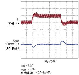 為了減少外部組件數(shù)目、降低成本并節(jié)省設計時間,開關頻率和環(huán)路補償可以用簡單的引腳設置。圖 1 顯示了一個典型應用。為了能以 2MHz 頻率工作,振蕩器頻率設定引腳 (RT) 連接到內部 3.3V 穩(wěn)壓器輸出引腳 (INTVCC)。當補償引腳 (ITH) 連接到 INTVCC 時,運用默認補償,從而產(chǎn)生一個干凈的負載瞬態(tài)響應 (圖 2)。