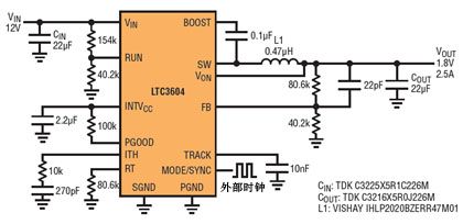 工作頻率在 800kHz 至 4MHz 范圍內,可用一個 RT 到地之間的外部電阻器編程。就開關噪聲敏感應用而言,LTC3601 和 LTC3604 可在相同的頻率范圍內從外部同步,而不管 RT 的狀態(tài)如何。無需外部 PLL 組件實現(xiàn)同步。