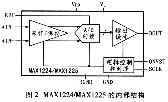 MAXl224/MAXl225系列12位模/數轉換器(ADC)具有低功耗、高速、串行輸出等特點,其采樣速率最高可達1.5Ms/s,在+2.7V至+3.6V的單電源下工作,需要1個外部基準源;可進行真差分輸入,較單端輸入可提供更好的噪聲抑制、失真改善及更寬的動態范圍;同時,具有標準SPITM/QSPITM/MI-CROWWIRETM接口提供轉換所需的時鐘信號,可以方便地與標準數字信號處理器(DSP)的同步串行接口連接。