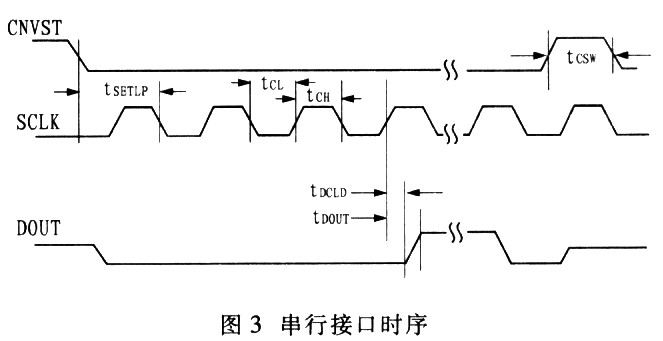 啟動轉換和讀數據操作由CNVST和SCLK端的數字輸入信號控制。圖3示出時序關系,描述串行接口的工作方式。