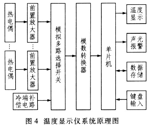 根據以上要求,筆者在溫度顯示儀的設計中以AT89C51型單片機為核心,采用MAX1224型12位串行A/D轉換器構成采樣模塊進行電路設計。溫度顯示儀的主要功能是完成實時溫度循環顯示功能,它主要用于工業現場中的加熱爐及具有較高溫度的場合,它的測溫范圍是O℃~1200℃,誤差要求小于±5℃。所設計的溫度顯示儀要求具有4路溫度檢測通道,由熱電偶采集現場溫度,并由冷端補償電路進行補償,再由前置放大電路將檢測到的微小信號轉變為ADC可轉換的信號。溫度顯示儀系統原理如圖4所示。