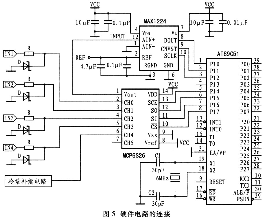 設計要求4路溫度檢測通道和l路冷端補償電路,所以本設計采用MCP6S26型6通道增益可編程放大器,該放大器特別適用于多路信號采集電路的設計,由于AT89C51單片機可以通過軟件對模擬信號電路進行控制,所以其適應性和靈活性大大提高。但是,由于AT89C51型單片機沒有3線制串行總線接口,它與MCP6S26進行3線制串行總線的連接時,要使用軟件來模擬3線制串行總線的操作,包括串行時鐘數據輸入和數據輸出。McP6S26與AT89C51的連接如圖5所示。圖中,P17模擬片選端CS,P14模擬時鐘輸入端SCK,P16模擬數據輸入端SI,P15模擬數據輸出端SO。