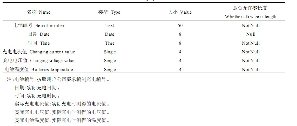 本系統(tǒng)設(shè)計(jì)了三個數(shù)據(jù)庫,用于標(biāo)準(zhǔn)充電曲線存儲、實(shí)際充電曲線存儲及分析結(jié)果存儲。使用VB6. 0提供的數(shù)據(jù)庫管理工具"可視化數(shù)據(jù)管理器"建立。其中實(shí)際充電曲線數(shù)據(jù)表如表1所示,數(shù)據(jù)庫的建立方便了對電池的查詢、分析,同時也方便了管理。