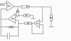 電壓-電流轉換模塊還有另外一種方案,即采用三個運放構成輸出電流可變的電流源,如圖3所示。輸出電流I=Vi/R1,為使R1兩端的電壓保持恒定,由差分放大器IC1b通過射隨器IC1c監(jiān)測R1兩端的電位,此電位經IC1b的7腳加到比較器 ICa的反相輸入端與Vref比較,根據(jù)比較結果使比較器的輸出端變化,直到平衡為止,即Vr1=Vi。電路中的電容用于補償ICa的頻率,減少控制環(huán)路的延時。只要R1=R2=R3=R4=R5,此電路的性能較好,但帶負載能力不強,環(huán)路延時補償對電路的穩(wěn)定有較大影響。