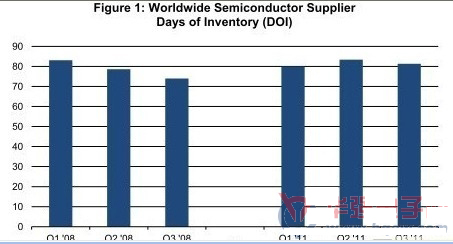 第三季度半導(dǎo)體庫存天數(shù)(DOI)為81天,比第二季度的83天下降2.5%。自從2009年第四季度以來,庫存天數(shù)就持續(xù)增加。2009年第四季度庫存天數(shù)只有67天,由于需求在衰退時(shí)期蒸發(fā),當(dāng)時(shí)庫存較低。此后,庫存天數(shù)不斷攀升,如圖1所示。庫存上升,一方面是因?yàn)樾枰a(bǔ)充衰竭的庫存,同時(shí)也是為了滿足不斷增長的需求。第三季度庫存約為369.6億美元,低于第二季度時(shí)的372.9億美元。
