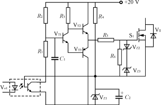 設(shè)計(jì)的驅(qū)動(dòng)電路如圖5所示,它由驅(qū)動(dòng)脈沖放大和5V基準(zhǔn)兩部分組成。脈沖放大包括光耦Vo1,R1和R2,中間級(jí)的VT1,推挽輸出電路VT2和VT3,對高頻干擾信號(hào)進(jìn)行濾波的C1;5V基準(zhǔn)部分包括R4,VZ1和C2,它既為MOS管提供-5V的偏置電壓,又為輸入光耦提供副邊電源。其工作原理是: