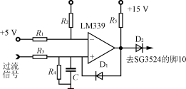 過流保護(hù)是利用SG3524的腳10加高電平封鎖脈沖輸出的功能。當(dāng)腳10為高電平時(shí),SG3524的腳11及腳14上輸出的脈寬調(diào)制脈沖就會(huì)立即消失而成為零。過流信號(hào)取自電流互感器(對SG3524-1芯片串接在工頻變壓器的副邊,對SG3524-2芯片串接在濾波電路前),經(jīng)整流后得到電流信號(hào)加至如圖6所示過流保護(hù)電路上。過流信號(hào)加至電壓比較器LM339的同相端。當(dāng)過流信號(hào)使同相端電平比反相端參考電平高時(shí),比較器將輸出高電平,則二極管D2將從原來的反向偏置狀態(tài)轉(zhuǎn)變?yōu)檎驅(qū)ǎ淹喽穗娢惶嵘秊楦唠娖剑@一變化將使得電壓比較器一直穩(wěn)定輸出高電平封鎖脈沖,則Boost電路停止工作,在正常狀態(tài)下,比較器輸出零電平,不影響B(tài)oost電路工作。