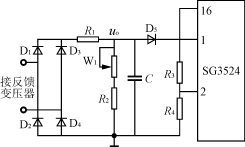 反饋調(diào)壓電路圖如圖7所示。當(dāng)逆變器正常工作時(shí),逆變器的輸出信號(hào)接反饋?zhàn)儔浩鳎涠坞妷航?jīng)整流,濾波,分壓得到反饋電壓uo,顯然,uo的大小正比于逆變器的輸出電壓。調(diào)節(jié)W1可調(diào)節(jié)負(fù)反饋電壓的大小,從而調(diào)節(jié)逆變器輸出電壓的幅值。uo控制信號(hào)被送到SG3524-1芯片的誤差放大器的反相端腳1。誤差放大器的同相端腳2接參考電平。這樣,SG3524的輸出脈沖的占空比就受到反饋信號(hào)的控制。調(diào)節(jié)過程是這樣的,當(dāng)逆變器輸出因突加負(fù)載而降低時(shí),它會(huì)使加在SG3524-1的腳1的輸入反饋電壓下降,這會(huì)導(dǎo)致SG3524-1輸出脈沖占空比增加,從而使得Boost電路輸出電壓升高,逆變橋的直流電壓升高,逆變器輸出交流電壓升高。反之亦然。可見,正是通過SG3524-1的脈寬調(diào)制組件的控制作用,實(shí)現(xiàn)了整個(gè)逆變器的輸出自動(dòng)穩(wěn)壓調(diào)節(jié)功能。