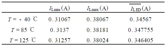 在V in = 12V 時,對LED 驅動電流進行溫度特性仿真,三次仿真波形結果分別如表2 所示。 可以看出,芯片的溫度特性較好。