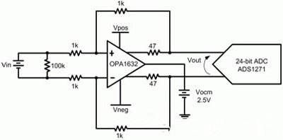 由于運算放大器的PSRR進一步降低了電源的微小變化,因此您可能會錯誤地得出如下結論:電源電壓的微小變化在系統中影響極小或者沒有影響。作為一個定量舉例,我們可對一個全差動運算放大器進行分析,其將信號緩沖至一個24位ADC。