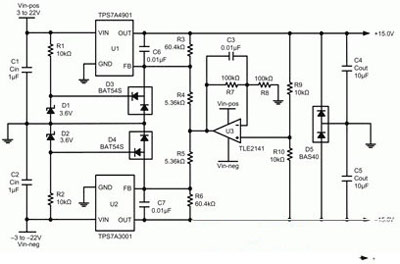 圖5所示電路使用一個如TPS7A3001等可調節、負輸出電壓LDO線性穩壓器,以及如TPS7A4901等可調節、正輸出電壓LDO。U3、R7-R10和C3均為增加的組件,用于追蹤。R1、R2、D1-D5均為增加組件,用于將反饋引腳的電壓控制在其各自產品說明書額定的絕對最大電壓范圍內。