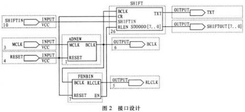 在圖2中,輸入為MCLK(主時鐘)、RESET(啟動信號)和SHIFTIN(A/D輸出數(shù)據(jù)),輸出為RL(左右?guī)盘?、BCLK(A/D數(shù)據(jù)位時鐘),TXT(并行數(shù)據(jù)讀取控制)和SHIFTOUT(并行數(shù)據(jù)輸出)。通過時鐘控制輸出BCLK和 RLCLK到AD1871,AD1871傳出數(shù)據(jù)SHIFTIN進入SHIFT模塊,SHIFT模塊在正確的位時鐘下讀取SHIFTIN的輸入數(shù)據(jù),并進行串,并轉換,之后輸出8位或12位的數(shù)據(jù)。同時輸出TXT并行數(shù)據(jù)讀取控制。